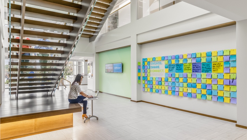 This three-story building with an elegant glass entryway features optimized interior spaces including offices, training rooms, and conference facilities appointed with ergonomic furniture and LED lighting. The expansive atrium welcomes employees to move through an inviting space with abundant natural light and offers an open staircase that promotes pedestrian traffic. Additional spaces that meet the WELL Building Standard, include a fitness center, studio space, relaxation areas, cafeteria, and outdoor patio space.