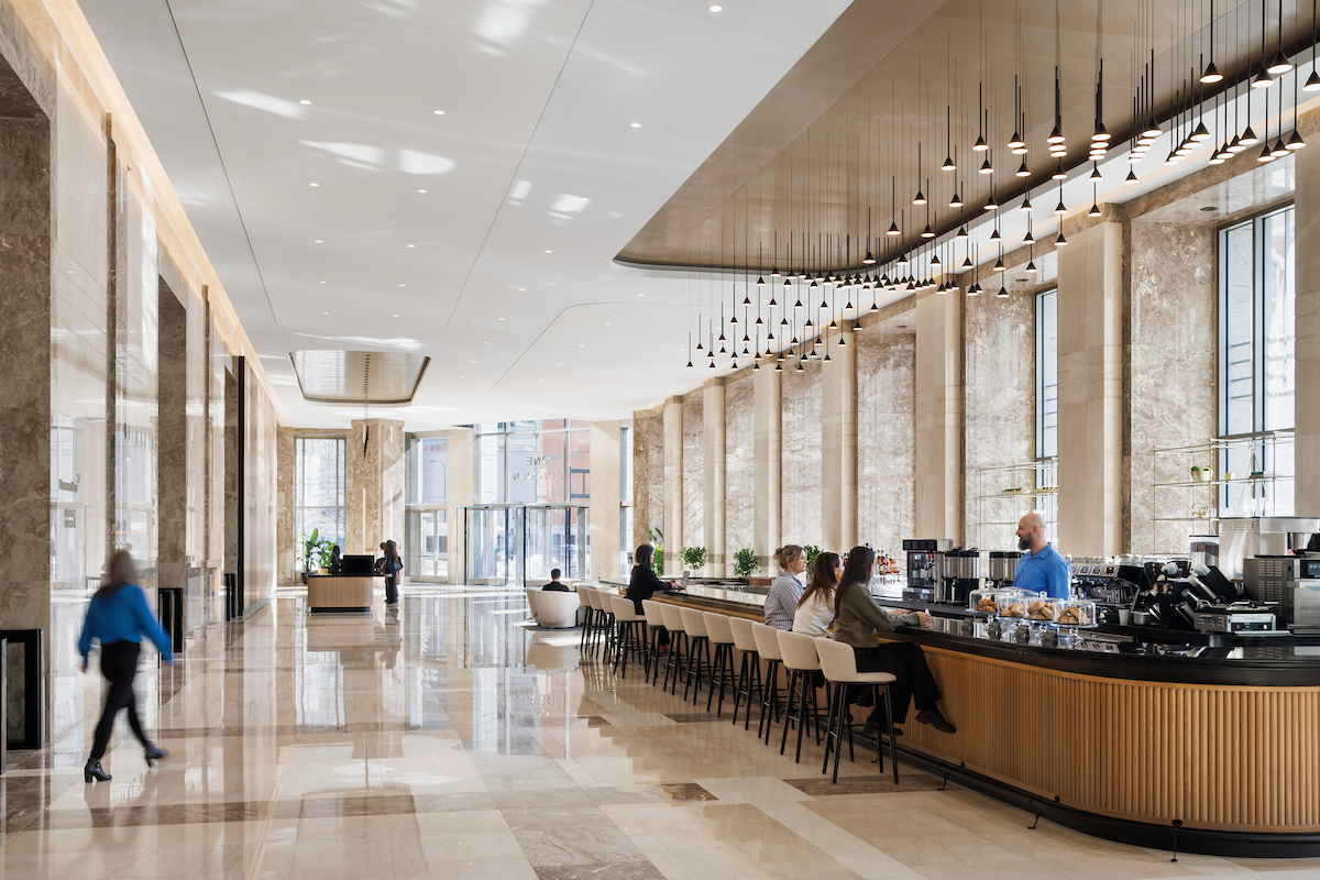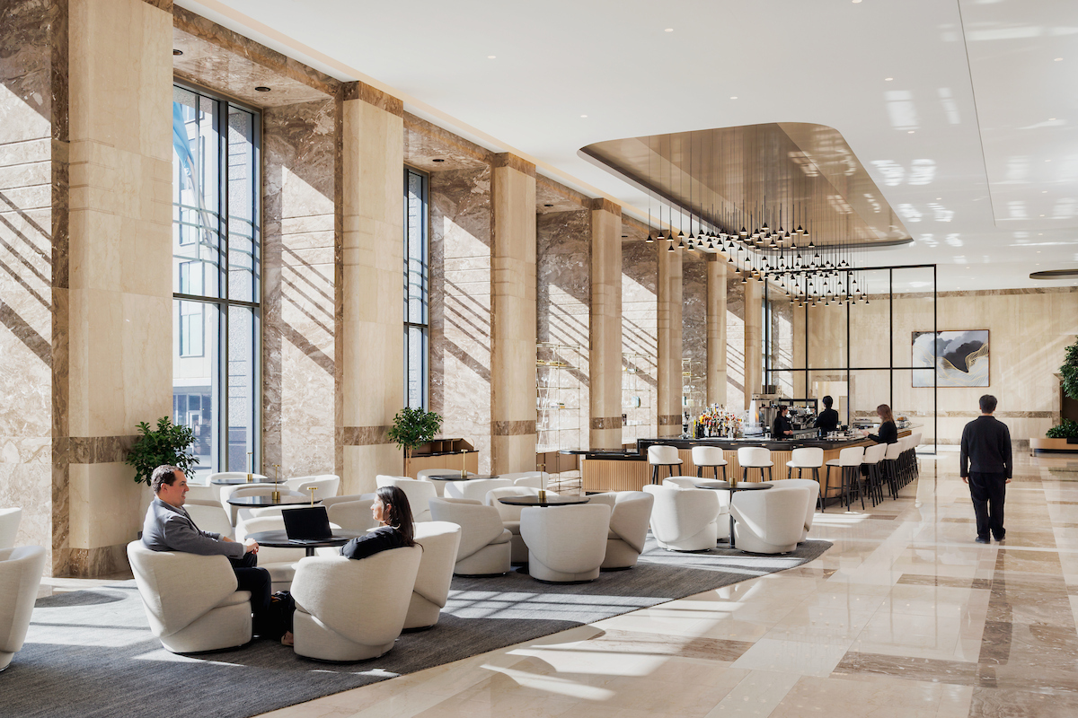 The main lobby was remodeled with high-end finishes, a comfortable lounge area, an outdoor patio with seating, and a public food hall with a diverse variety of vendors.