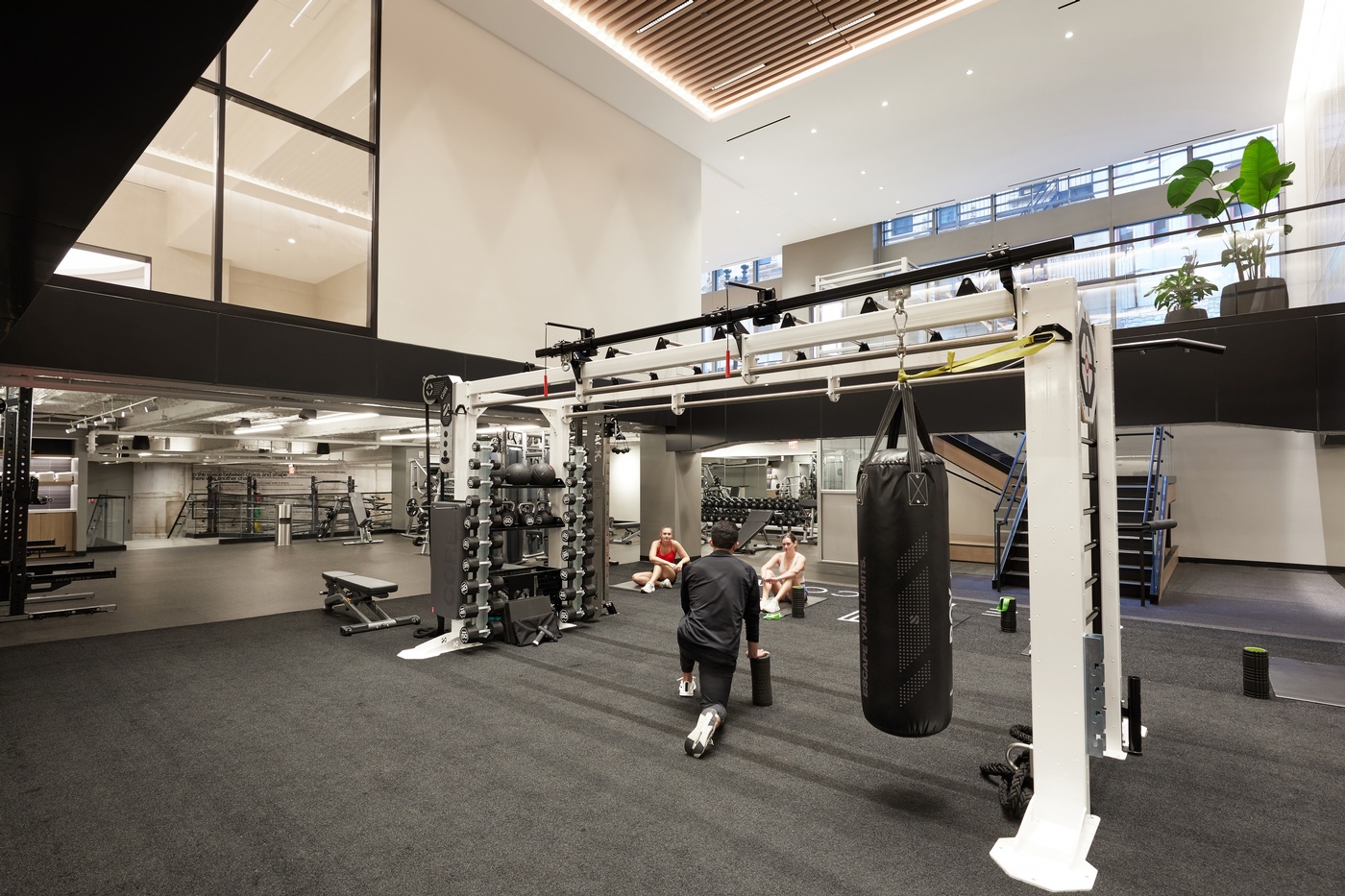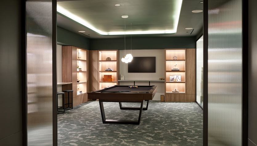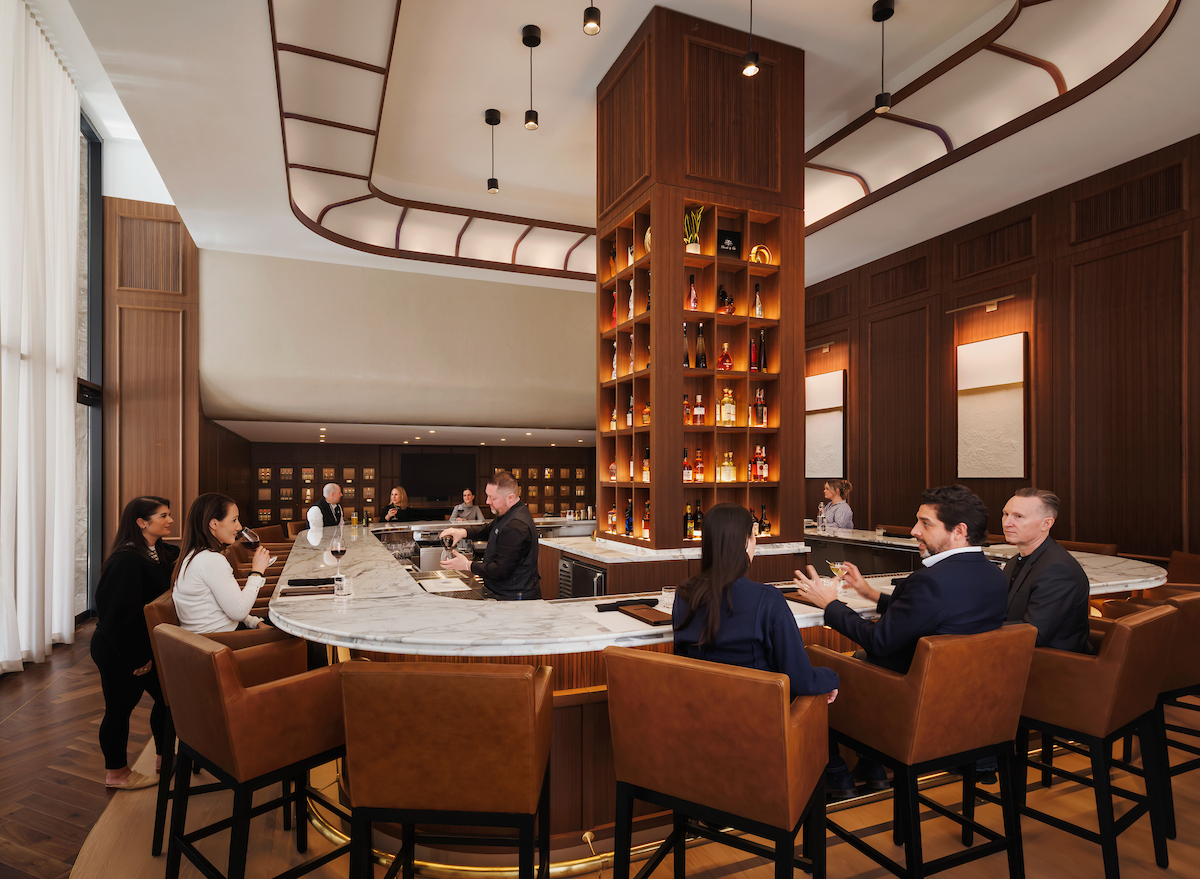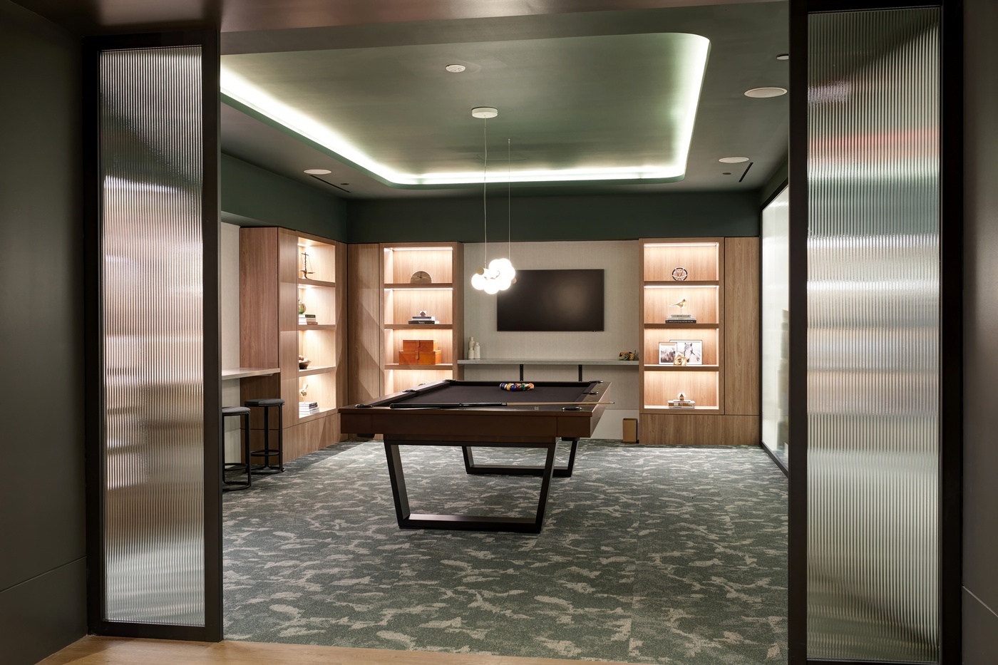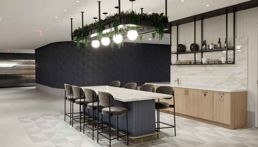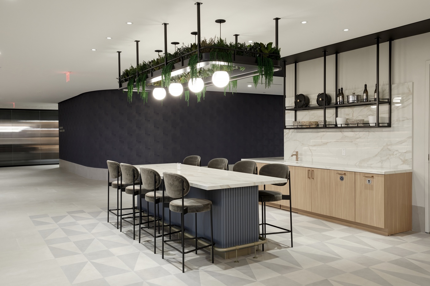 Amenities for building tenants include areas for both work and recreation. A flexible, multi-purpose town square serves as a hub for events, complemented by conference rooms, work spaces, and a warming kitchen to accommodate catered functions. A gaming lounge, whisky bar, and sub-level fitness center provide opportunities for tenants to gather informally.