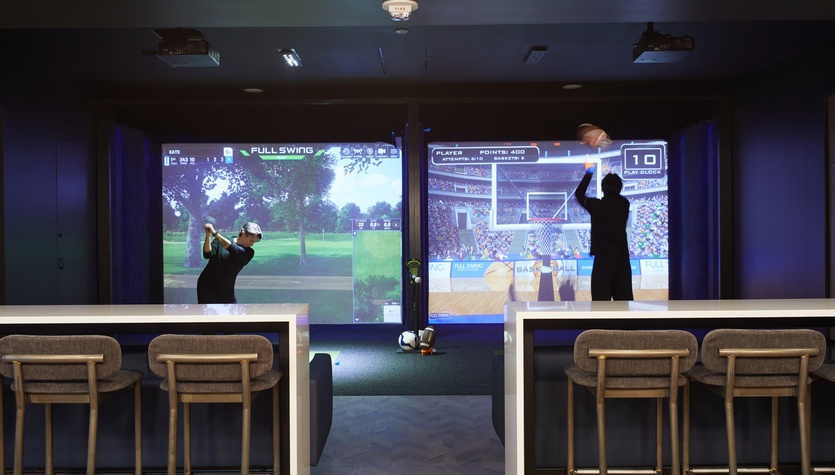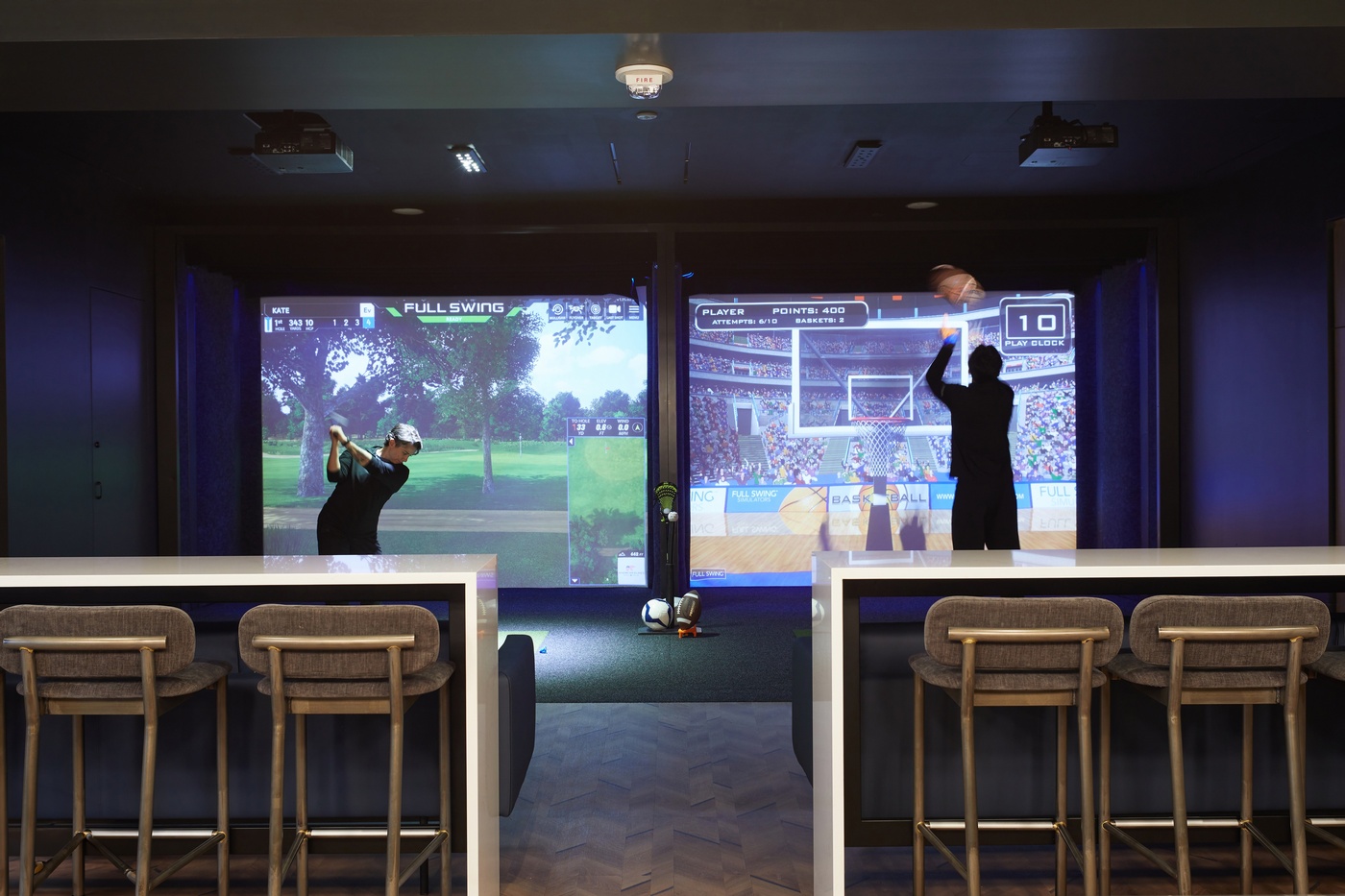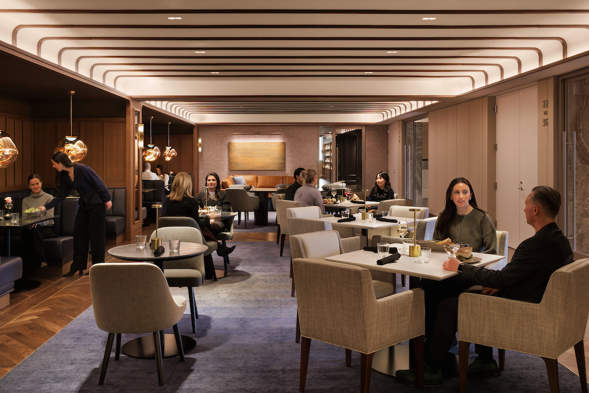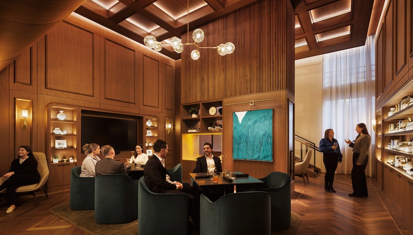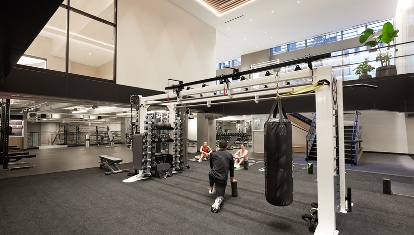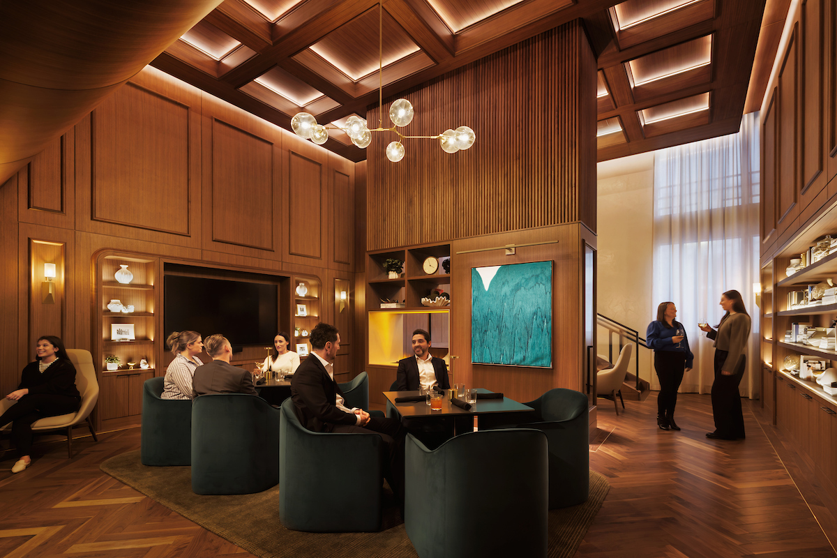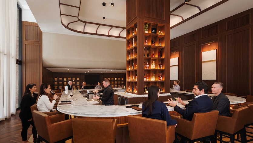 Amenities for building tenants include areas for both work and recreation. A flexible, multi-purpose town square serves as a hub for events, complemented by conference rooms, work spaces, and a warming kitchen to accommodate catered functions. A gaming lounge, whisky bar, and sub-level fitness center provide opportunities for tenants to gather informally.