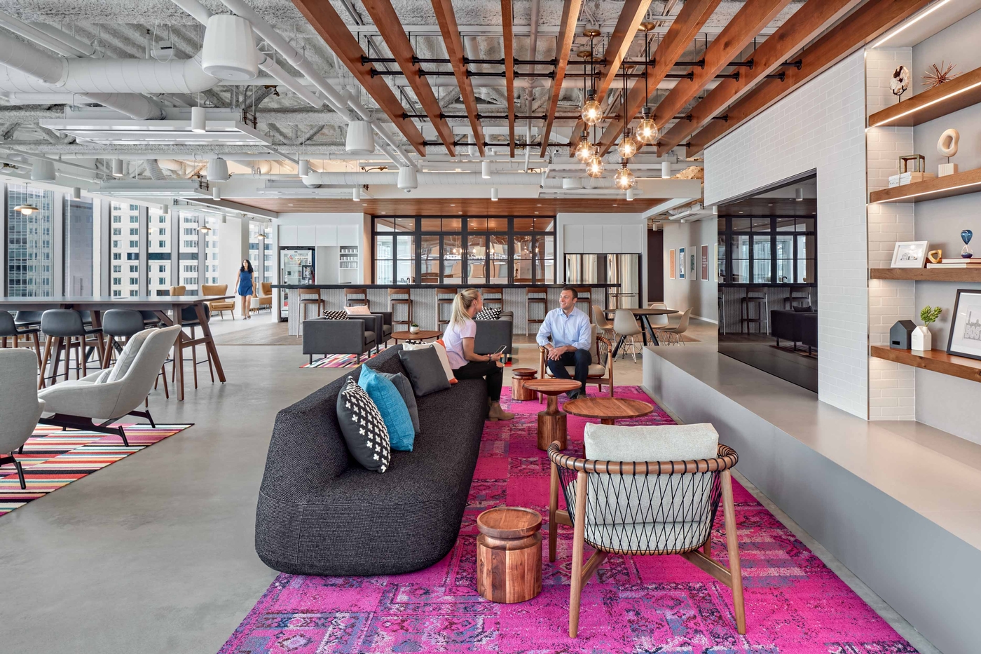 The new office space combines open workstations, private offices, conference rooms, and a large cafe. The welcoming reception area has several custom features including a decorative brick fireplace with smoked glass and integrated wood shelving, as well as wood frame pass-through windows between the reception area and cafe; they can be closed to divide the two spaces or opened to integrate them. High-end finishes include polished concrete, and wood paneling, flooring, and ceiling elements in select areas. A custom operable partition modeled after a garage door brings a unique design element to the office. Chilled beams were installed throughout to provide optimal occupant comfort and energy efficiency.